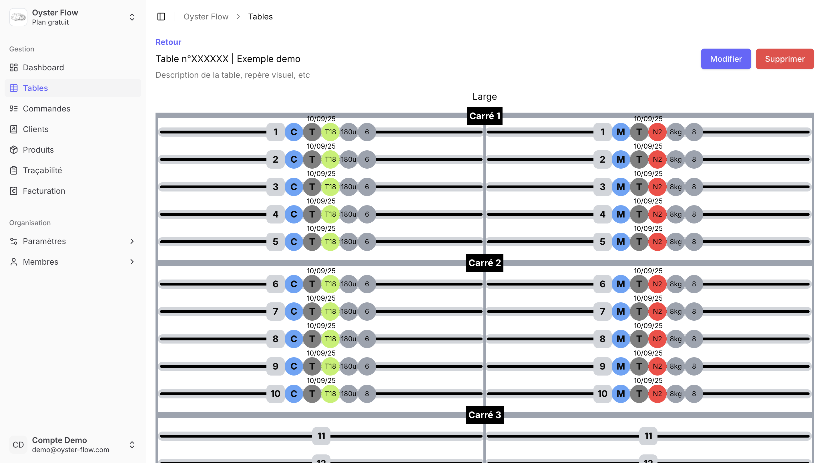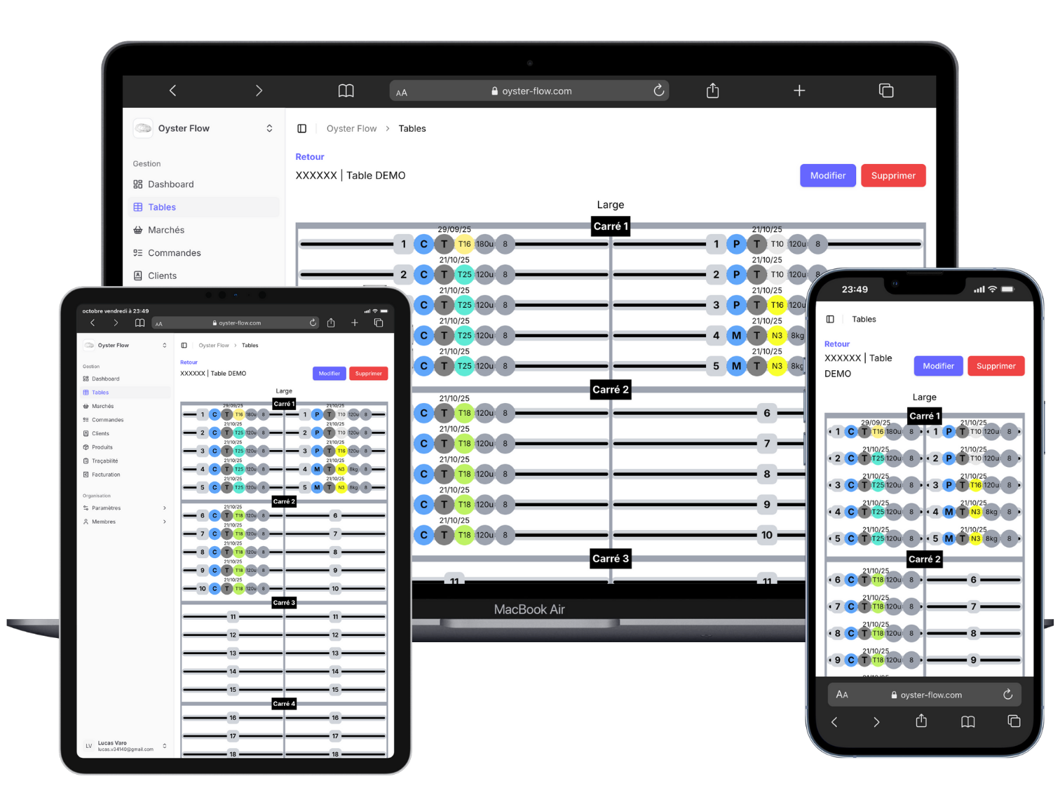 Oyster Flow est la plateforme pensée pour les conchyliculteurs : gérez facilement vos huîtres sur table, vos clients, vos commandes, vos factures et la traçabilité de votre production, le tout en quelques clics.